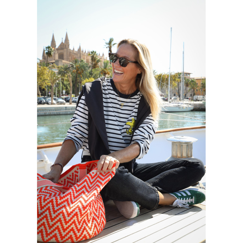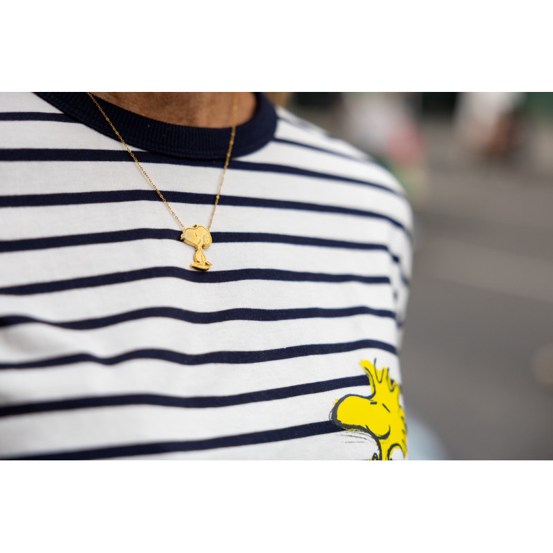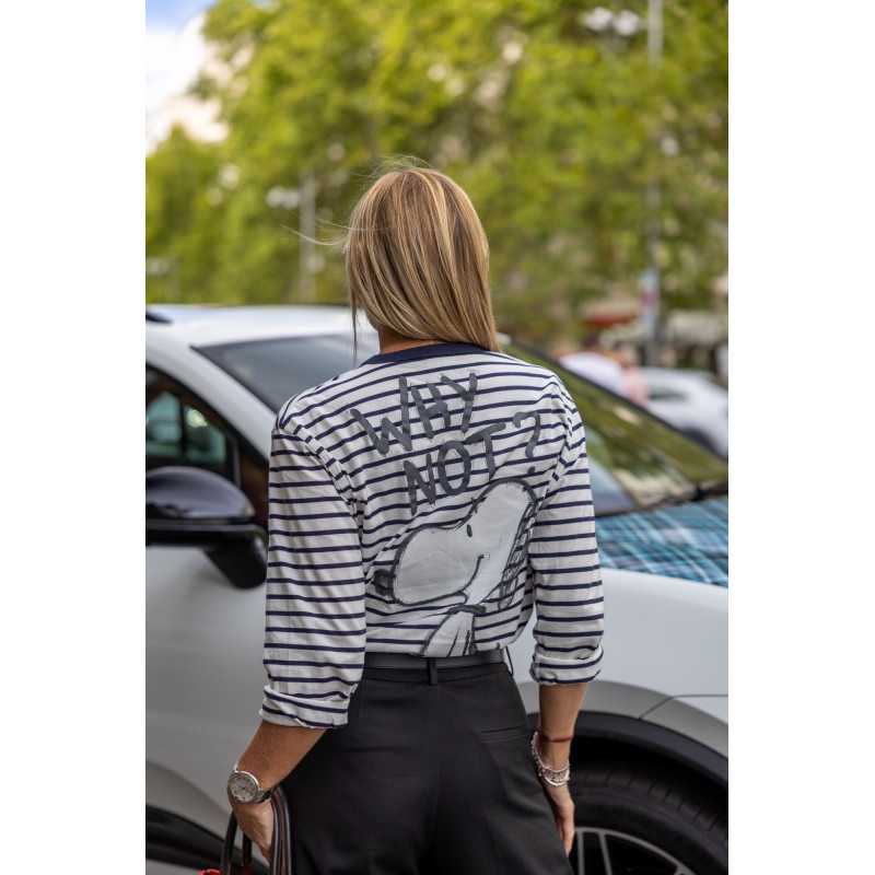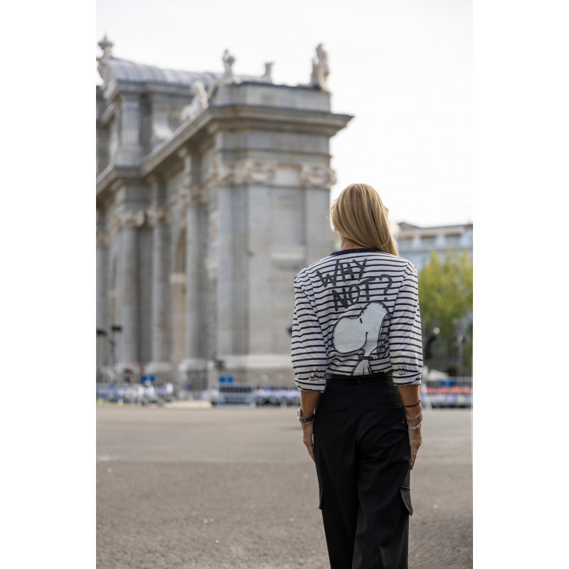 Camiseta de rayas de snoopy con texto "why not?" de la colección de Fiona Ferrer x Peanuts. Camiseta de manga larga marinera de corte recto.