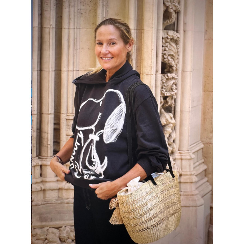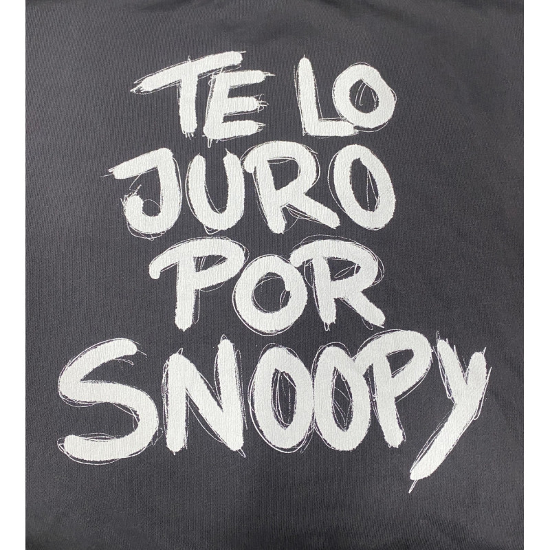 Sudadera negra texto "te lo juro por snoopy" de la colección de Fiona Ferrer x Peanuts. Sudadera oversized con capucha, dibujo de snoopy por delante y texto por detrás.